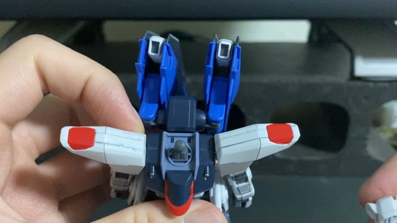 背中の翼パーツとは二2穴のジョイントでつながれていて、ほかのHGのバックパックのパーツと取り換えれるように見えますが、